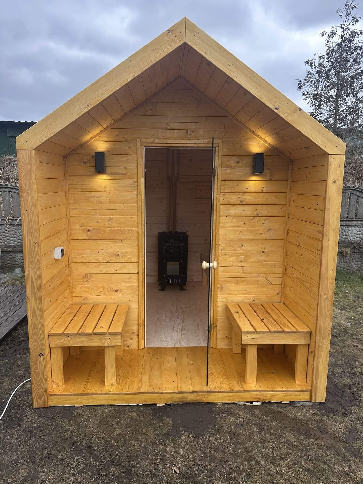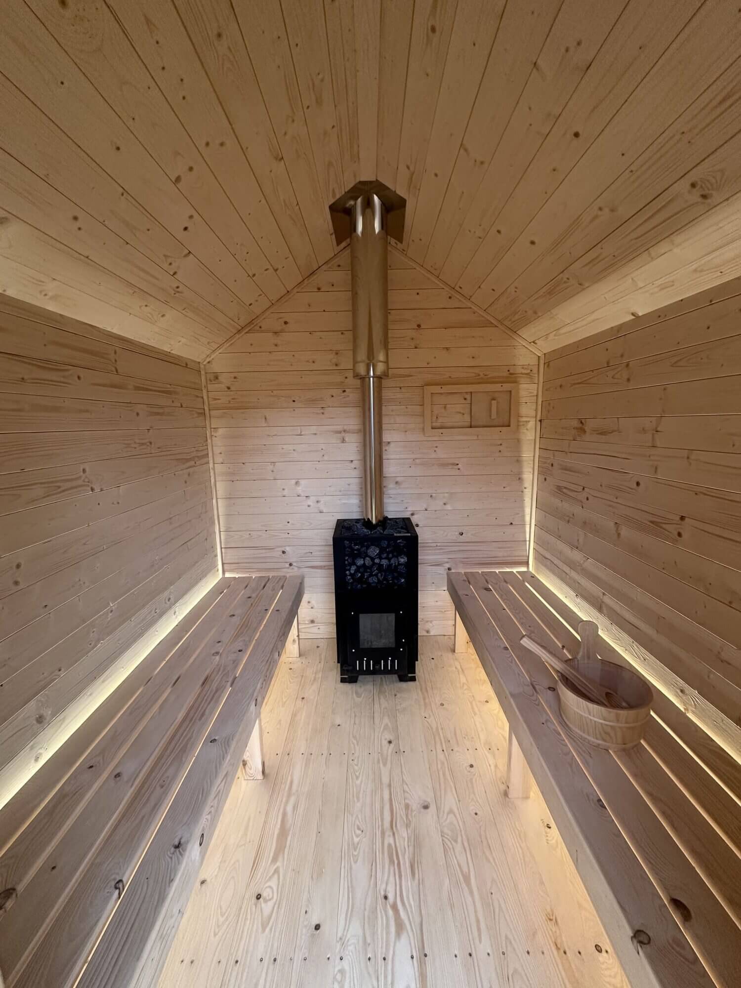 Wnętrze sauny wykończony jest elegancką boazerią z świerku europejskiego, która doskonale znosi wysoką temperaturę i wilgotność. Komfort wypoczynku zapewniają ergonomiczne ławki wykonane z drewna świerkowego – przyjemnego w dotyku i odpornego na nagrzewanie.